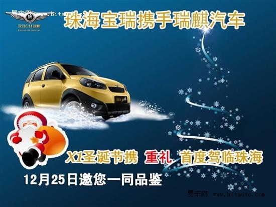 奇瑞珠海上冲4S店——珠海宝瑞车业有限公司将于12月25日下午14:00在展厅中举行“迎新圣诞狂欢派对”。届时,作为奇瑞汽车旗下高端品牌——瑞麒汽车,也将于圣诞节正式与宝瑞公司携手,首度登陆珠海。