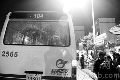 昨晚7时40分,一辆104路公交车行驶到教场北路长城小区门口时,后窗玻璃遭到子弹状物体袭击,玻璃上留下黄豆大小的窟窿,整块玻璃裂成网状。